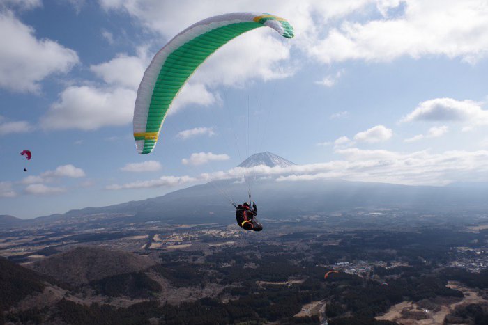 スタートタイムの11時には、グループソアリングの練習の成果が表れ、参加者全員が2尾根上空1700mから一斉にスタート。