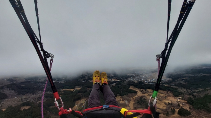 キーンと冷えた朝となりました。今日は北風のち南風の予報。まずは北風が収まるまでプチ講習。サーチするグライダーを止めようとちょっとブレークを引くとさらにグライダーは前方に行こうとします・・などなど。パラグライダーの技術向上には正しい知識が必要です。さて、北風はまだ吹いていますが、テイクオフへGo! 風が変わるのを待ってフライト開始。こんな日はあっというまに上昇していきます。上昇すると寒さとの戦い・・。無理のないようにみなさんソアリング。お昼までたっぷり飛んで、午後はグランドハンドリングと基礎練習。今日もたっぷりとパラグライダーで遊べた朝霧でした!