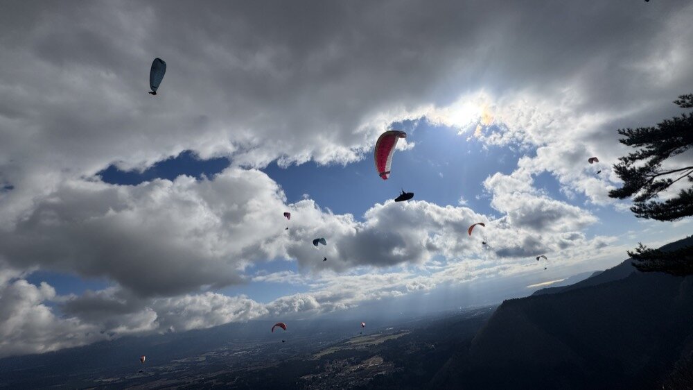 強い南風の前山磨きは難しいですが、初朝霧の参加者の方もなんとか2時間近く滞空することができ、最後は1500mアップで満足のいくフライトとなったようです。