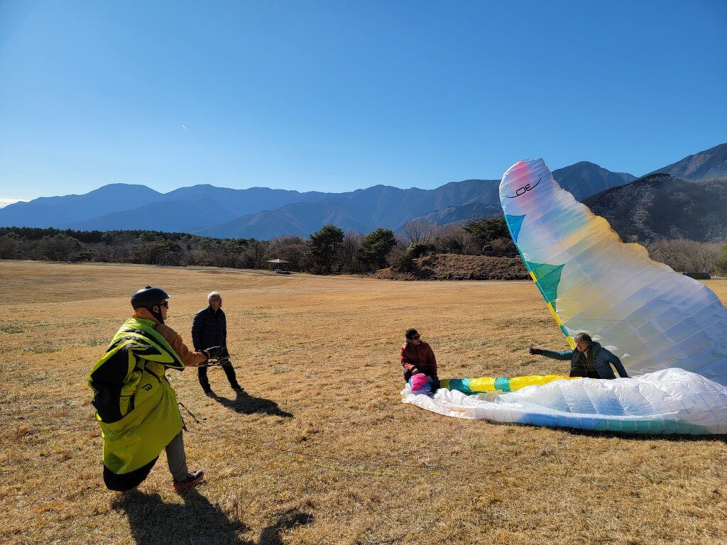 日中は強風予報でしたが、朝霧マジックが発動! 予想に反してコンディションが整い、11時過ぎまでフライトを楽しむことができました。上空1,700m以上は西風が強くシビアな状況でしたが、皆さん前山付近の良質なリフトをしっかりキープ!パフォセンメンバーで大きなガーグルを組みながら、冬の空を鮮やかに彩っていました。